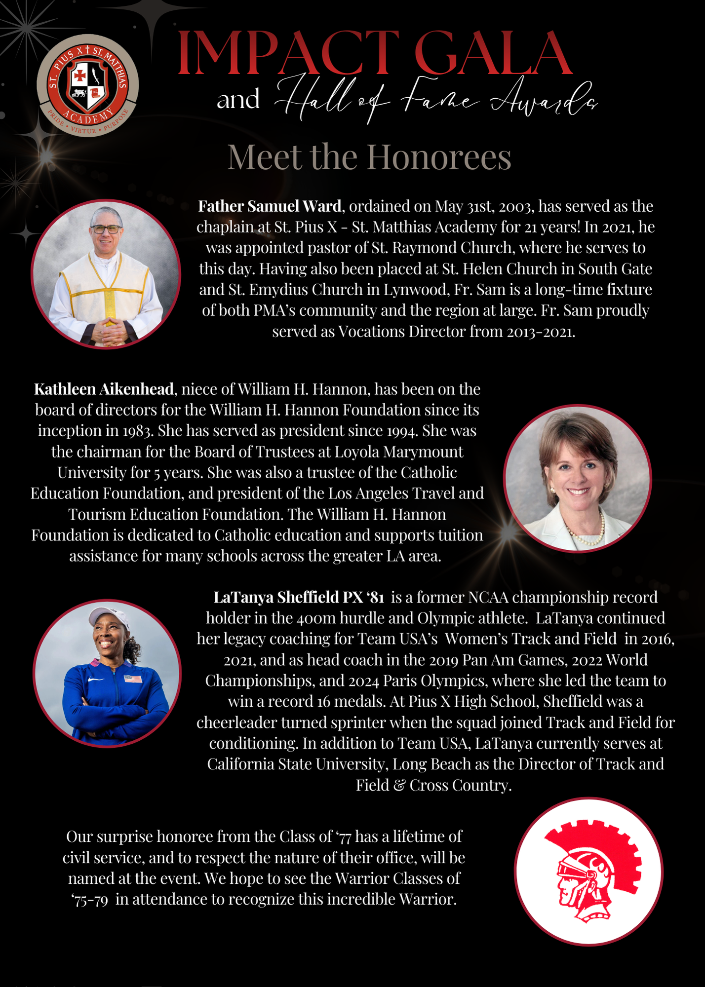 St. Pius X – St. Matthias Academy (PMA) is a co-ed Catholic school for grades 9-12 in Downey, serving over 600 students. This year, the school is hosting its biennial Impact Gala on April 25th at Bella Verde Golf Course! This event honors those who have made their mark on this school and given back in enormous ways. This year’s honorees are Fr. Samuel Ward, Kathleen Aikenhead of the William H. Hannon Foundation, and LaTanya Sheffield, PX ‘81. We hope you will join us in an evening of celebration, all in support of PMA’s stability and longevity.