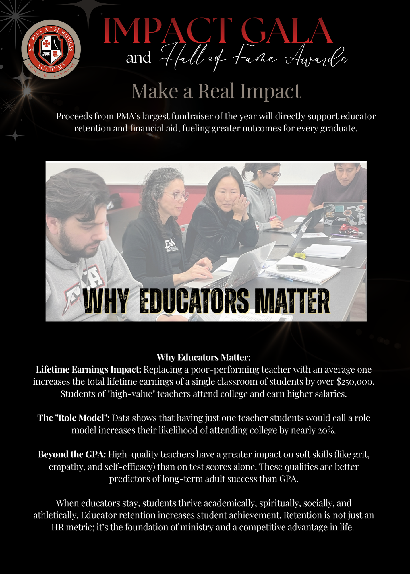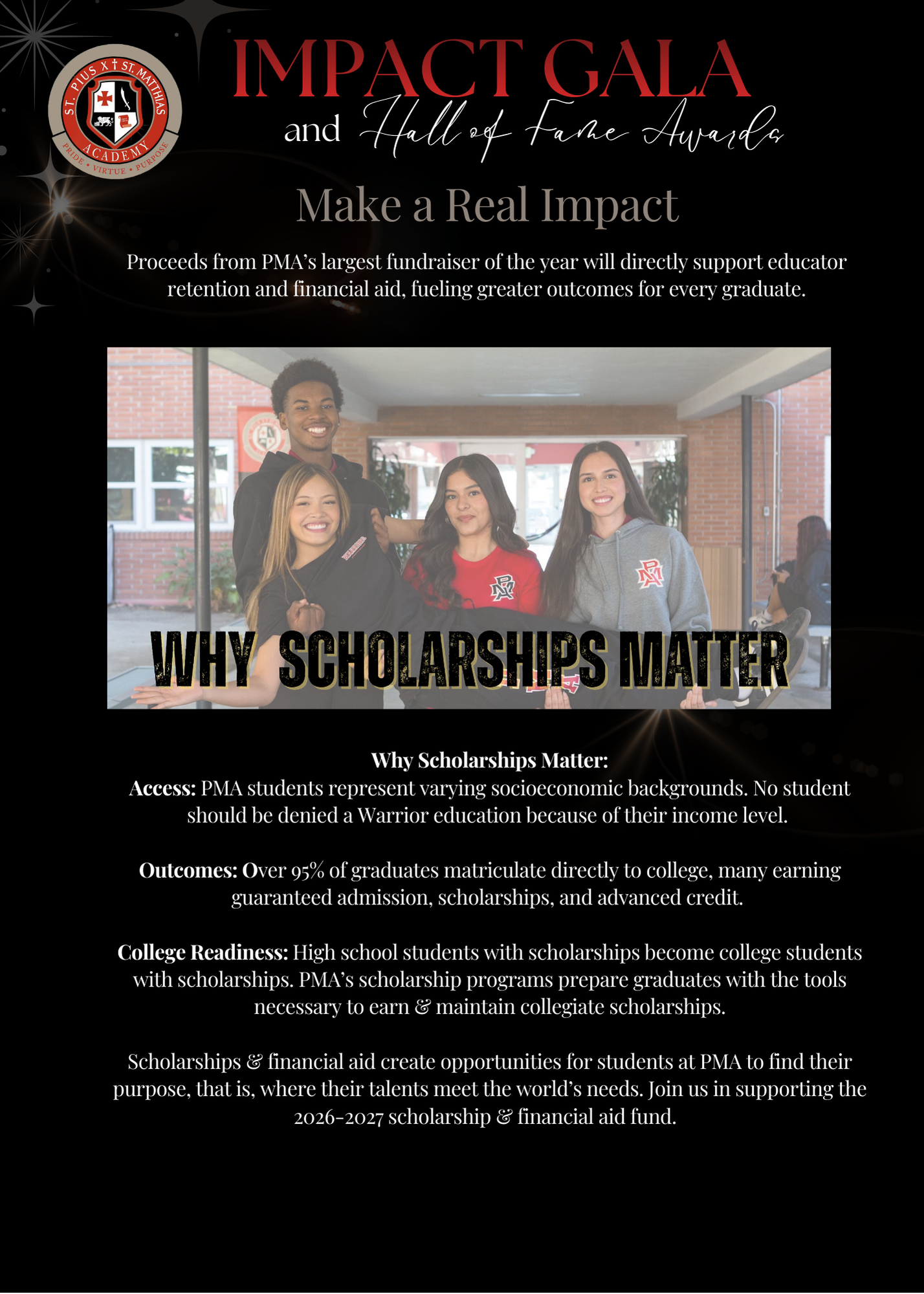 This evening will benefit St. Pius X - St. Matthias Academy and its greatest needs- supporting tuition assistance for its students and supplementing wage increases for the passionate and talented educators who ensure PMA students can grow in their faith, learn without limits, and live with a purpose. Currently, over 85% of PMA students demonstrate need to afford a PMA education. With the help of generous benefactors, over $3 million was allocated in tuition assistance and scholarships in 2025-2026. A gift to PMA is magnified by its results, as over 90% of PMA students matriculate directly to a college or university upon graduation. Among PMA’s recent graduates are Posse and Gates Scholars, future medical professionals, lawyers, engineers, NBA hopefuls, talented artists, athletes, future educators, and more.
